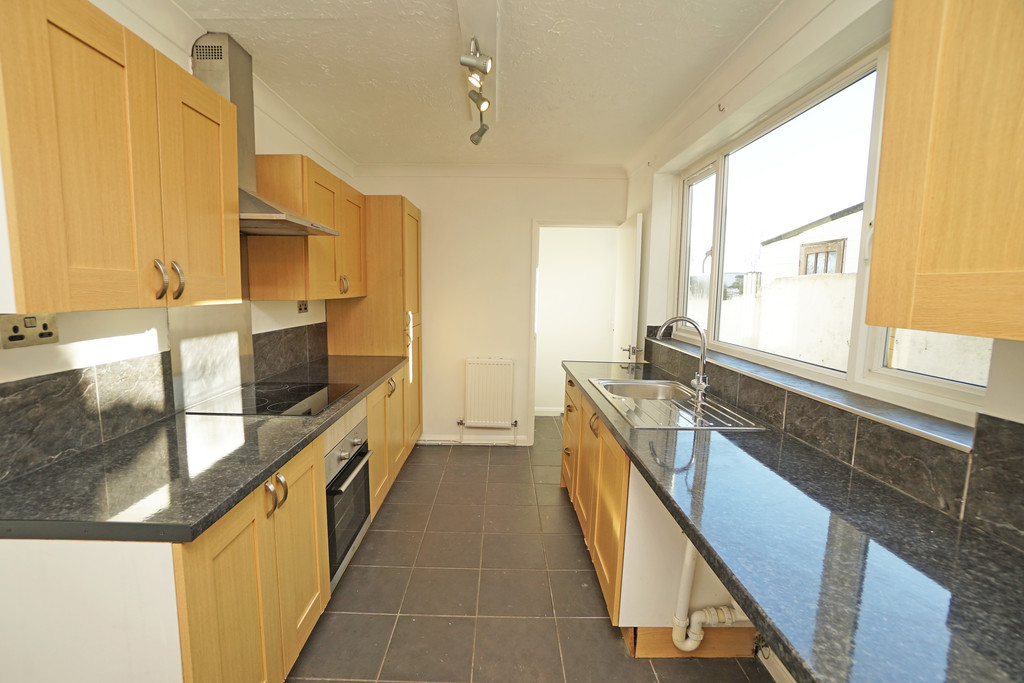 The kitchen is fitted with a range of wall and floor cupboards and has built in ceramic hob and electric oven plus space for the usual appliances. There is a tiled floor and large window providing lots of natural light.