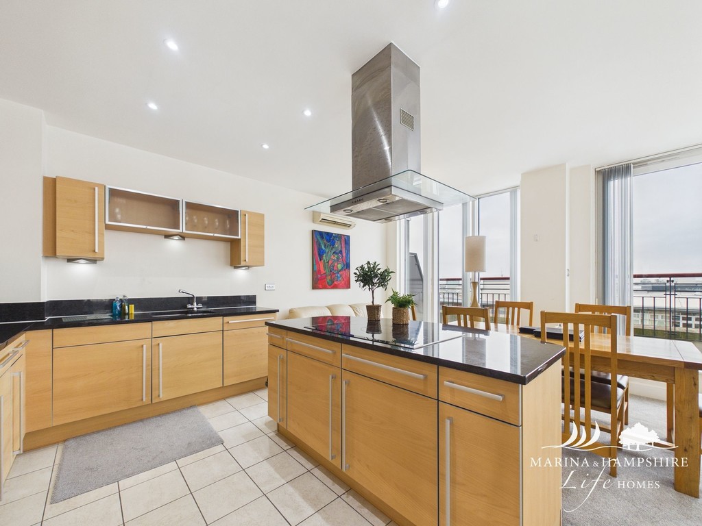 The property features a bright open-plan living and kitchen area, designed for comfortable contemporary living, with floor to ceiling windows offering stunning views to Gunwharf and the harbour beyond. The kitchen is fitted with integrated appliances and ample storage, making it both practical and modern.