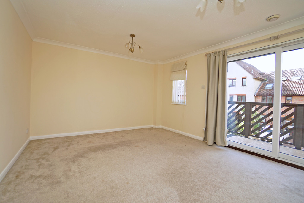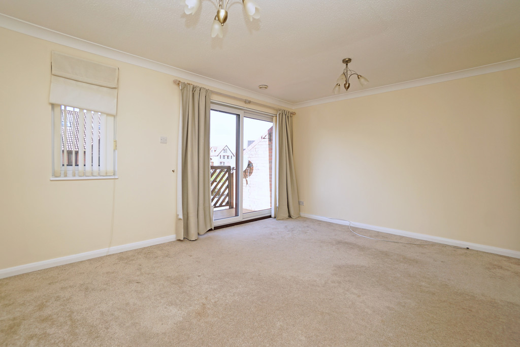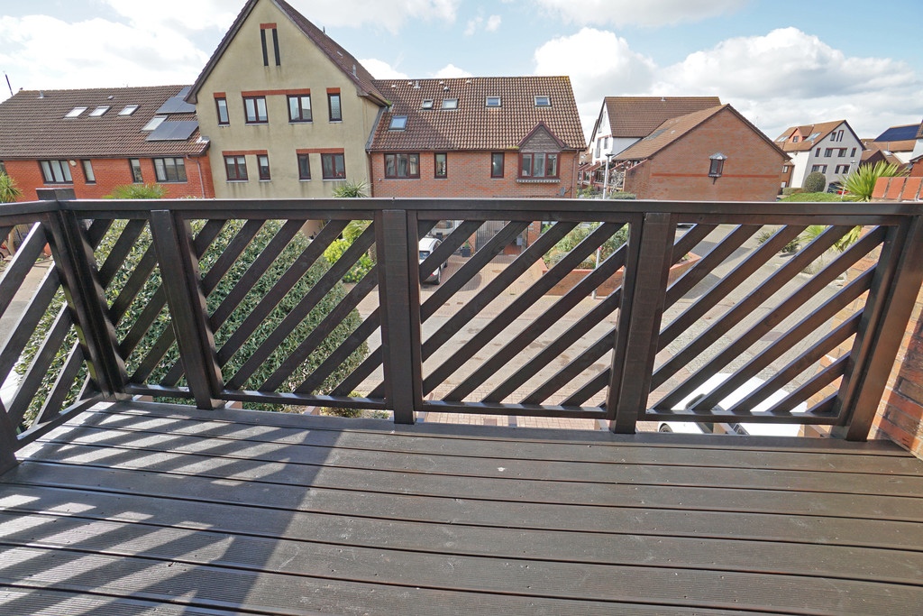 To the first floor, the landing leads to a spacious living room, two further bedrooms, and the family bathroom. The living room is bright and airy, with patio doors opening onto a generous south-facing balcony that spans the width of the property-ideal for outdoor relaxation.