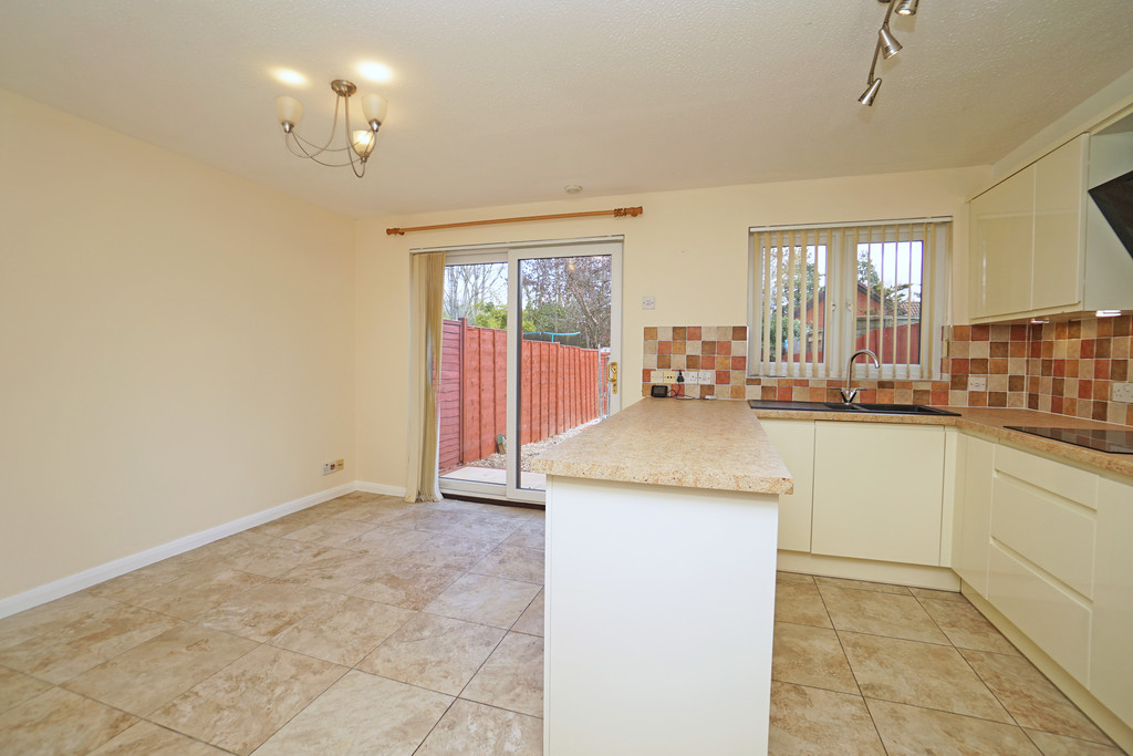 The kitchen/dining room is a stylish and well-equipped space, featuring a range of cream wall and base units, marble-effect worktops, and tiled splashbacks. Integrated appliances include a NEFF oven and grill, ceramic hob with extractor, dishwasher, and full-height fridge freezer. The room also benefits from a breakfast bar, spotlighting, and patio doors opening onto the garden.