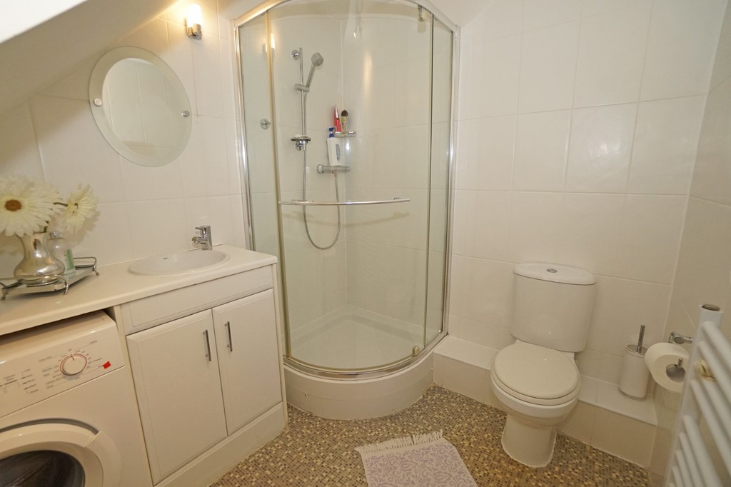 GROUND FLOOR SHOWER ROOM 7' 5" x 6' 3" (2.28m x 1.92m) Modern shower room fitted with white sanitary ware to include large corner shower cubicle with thermostatic shower fitted, wall hung sink, inset to vanity unit below. Low level WC. Washing machine (to be gifted). Heated towel rail.