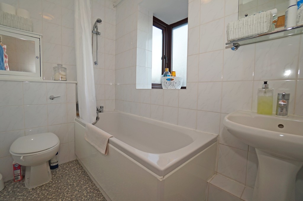 BATHROOM 7' 8" x 4' 11" (2.35m x 1.5m) Bathroom with white sanitary ware to include pedestal sink, low level WC and bath with mixer tap and shower fitted over. Window to side aspect. Heated towel rail. Mosaic effect vinyl flooring.