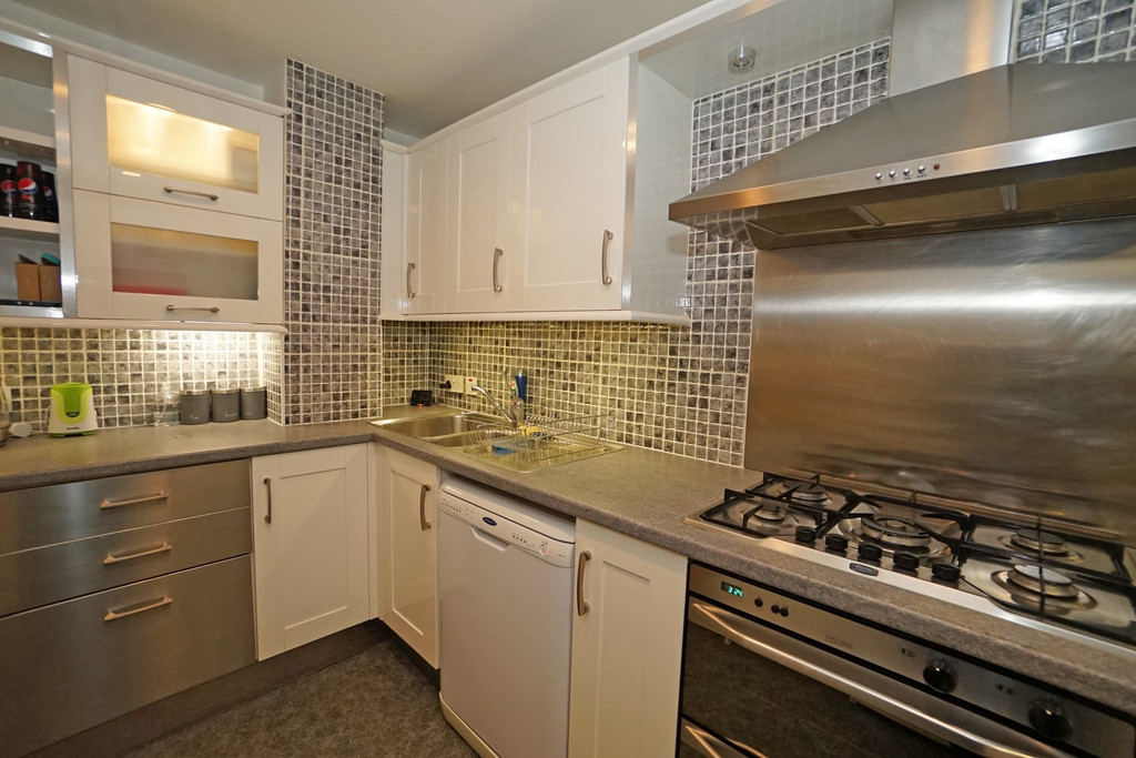 KITCHEN 10' 5" x 7' 4" (3.19m x 2.26m) The kitchen is fully equipped with Hotpoint fridge, freezer and dishwasher, 5 burner gas hob, chrome effect oven and washer dryer. Complimented with a mixture of white and stainless steel effect units and grey marble effect worktop gives the kitchen a real modern feel. This room also benefits from a breakfast bar separates the dining area from the kitchen.