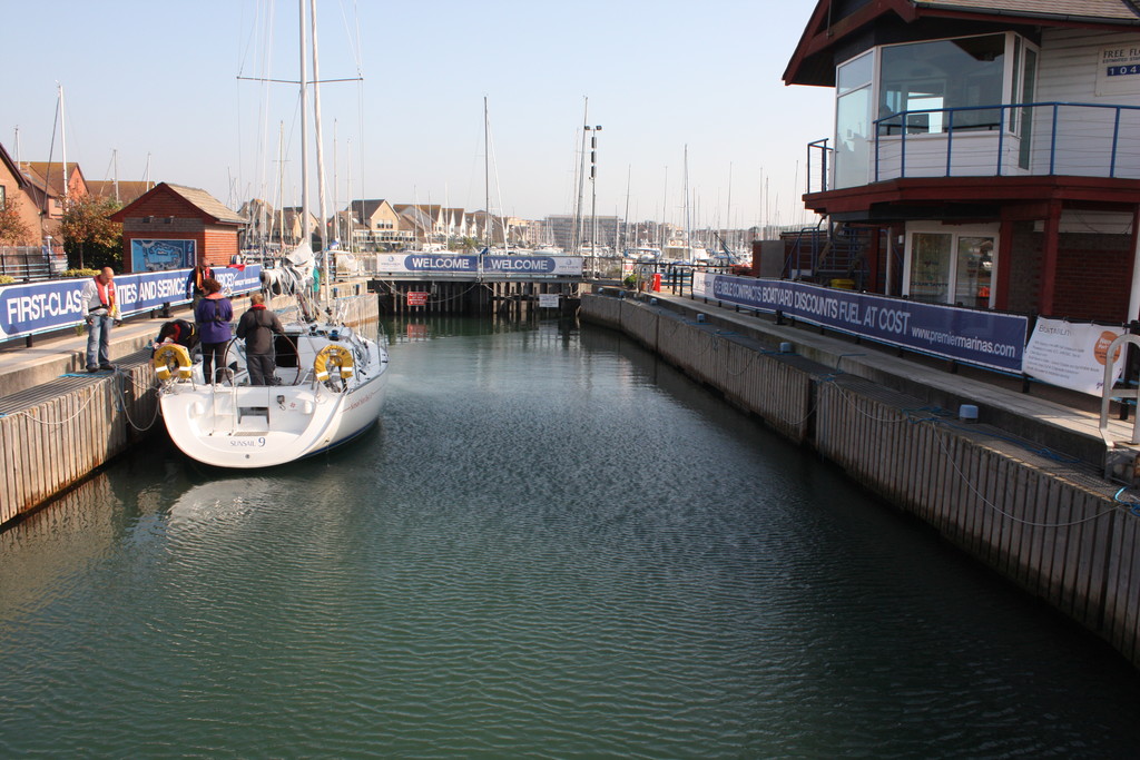 The marina is accessed via a 4‑mile well‑marked channel from the Portsmouth Harbour entrance, navigable day or night in most conditions.