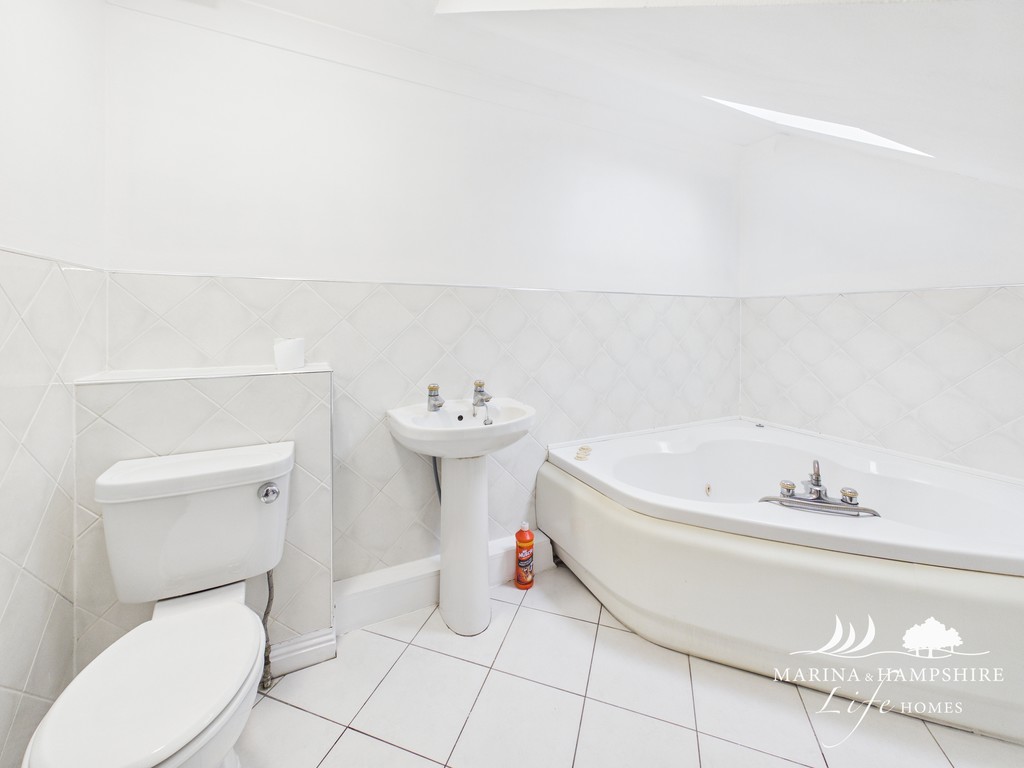 EN-SUITE 3.17m x 1.75m (10'5 x 5'9) The ensuite is white and bright and has a double glazed velux style window to side aspect, panel enclosed jacuzzi bath, low level WC, white pedestal basin, chrome heated towel rail to wall and is finished and a grey floor.