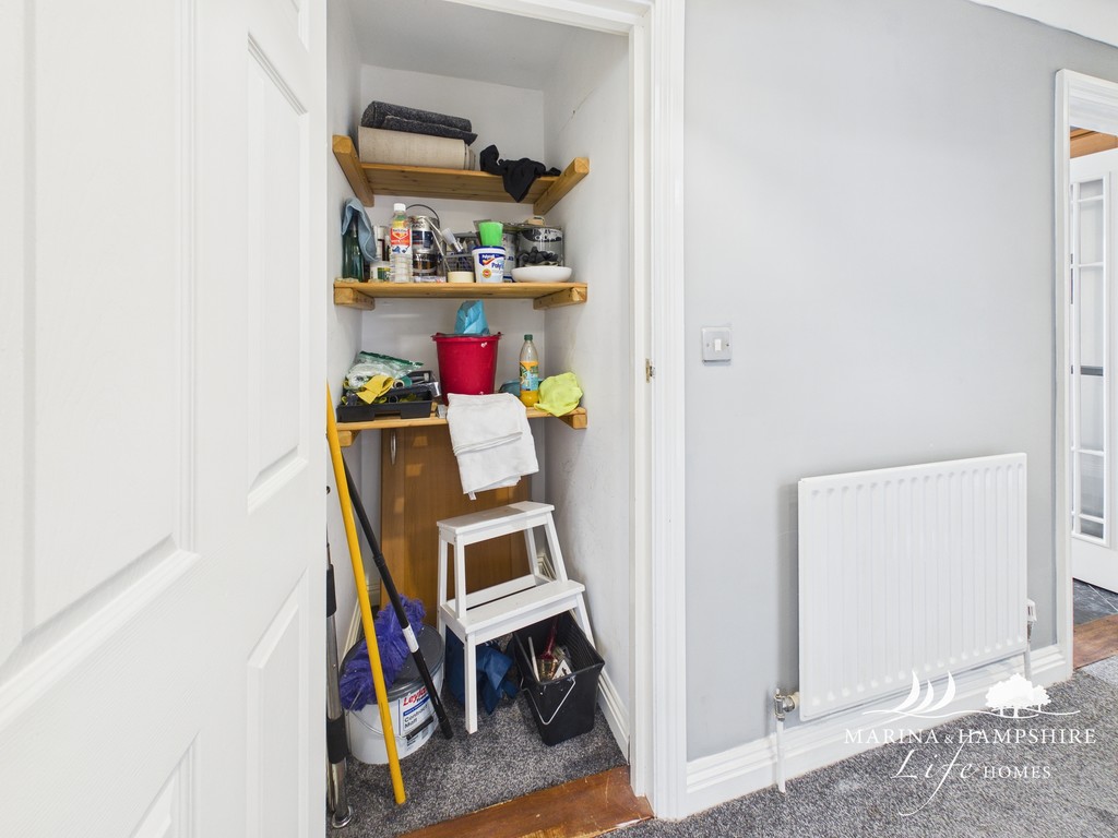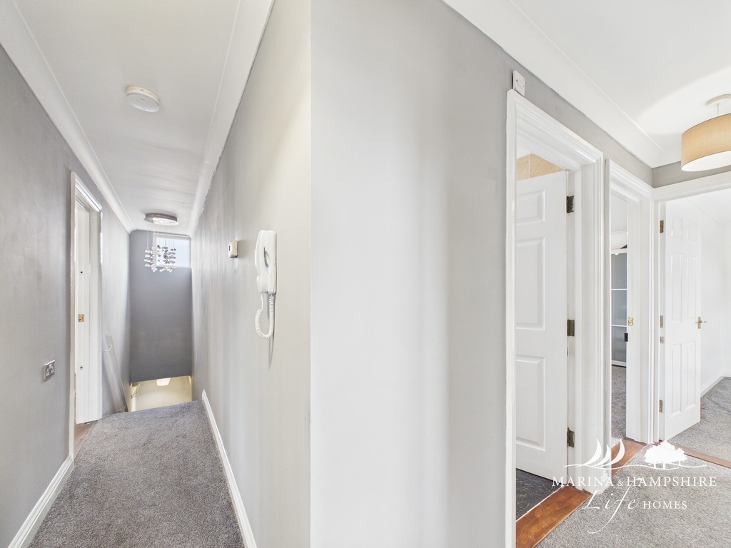 HALLWAY L shaped Hallway with doors leading to Lounge, Kitchen, White painted coved ceiling, Grey painted walls double glazed window to rear aspect, phone entry system, doors to lounge, kitchen, all three bedrooms and shower room. The hallway also has the added benefit of a large handy built in cupboard.