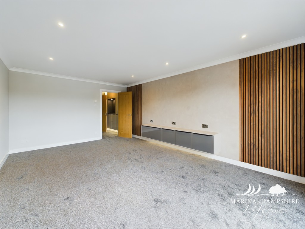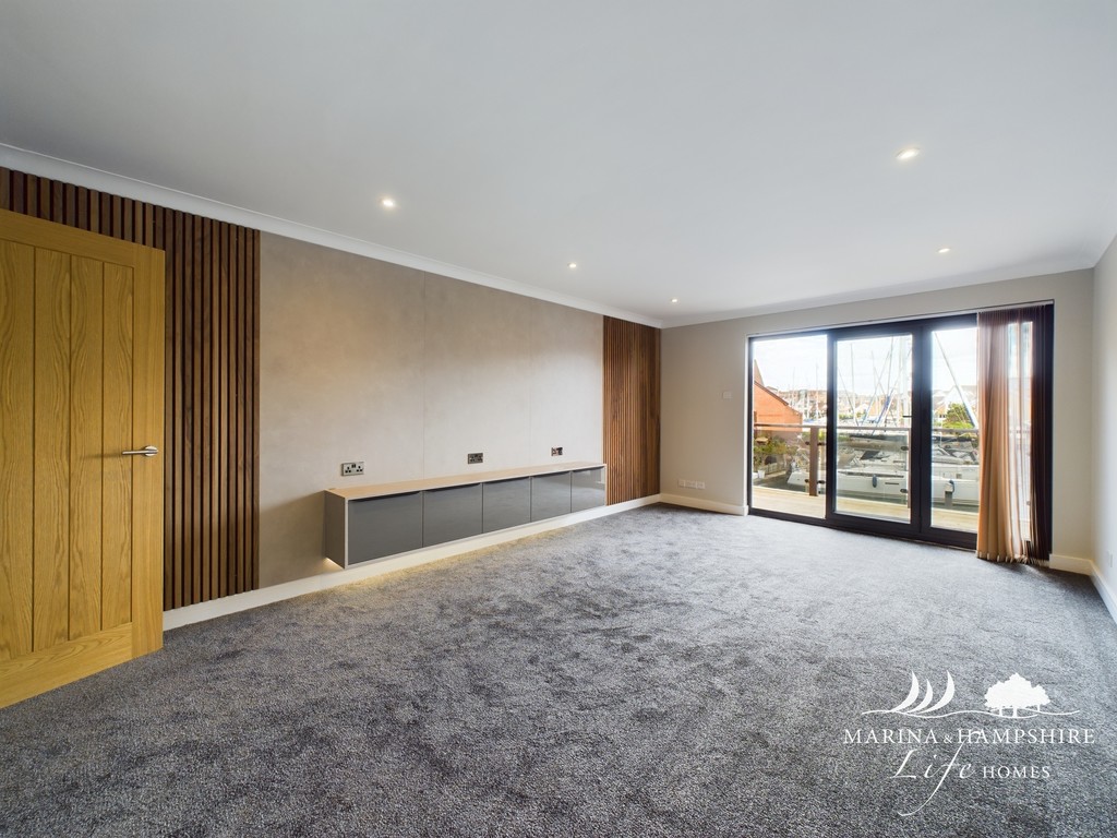 On the first floor landing you find doors to Bedroom 2, a further cloakroom and living room. Bedroom 2 is a double room overlooking the front aspect and has built in wardrobe and storage units. The living room has neutral decor and oak vertical panelling, wall hung media unit and aluminium bifold doors leading out onto the South East facing balcony. Here you can enjoy sunny marina views, a great place to sit and watch the world go by!