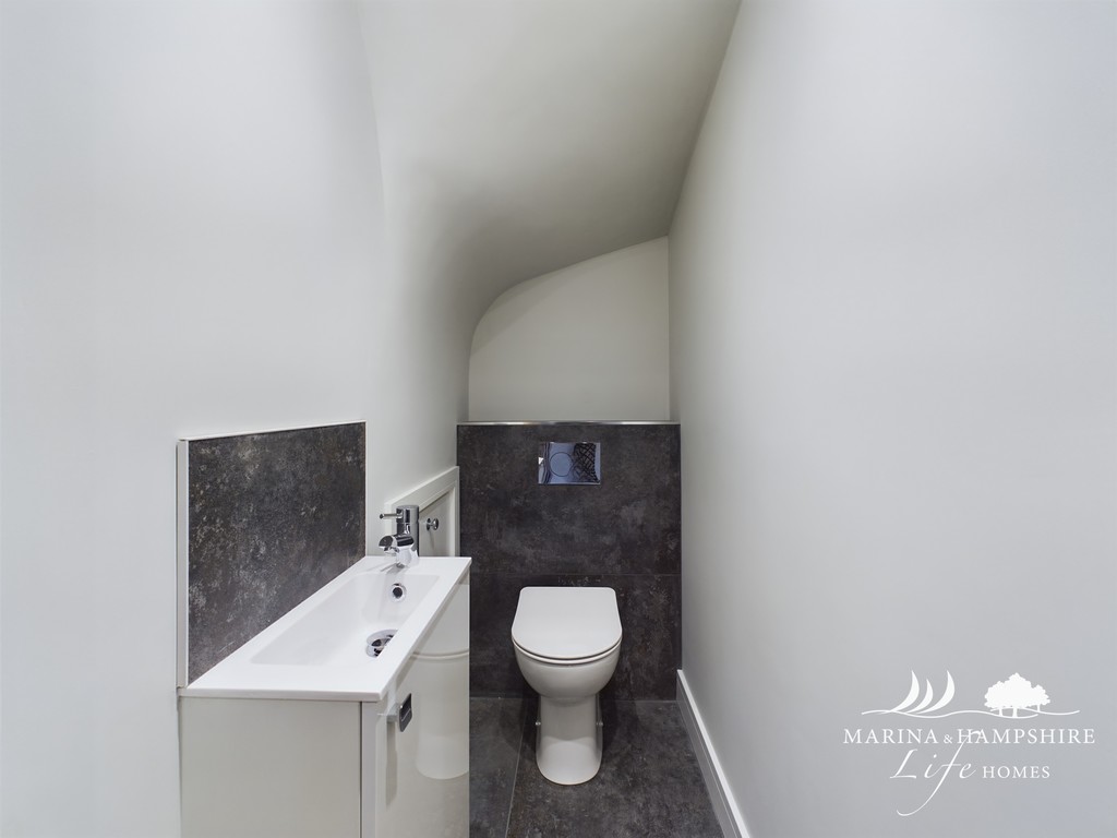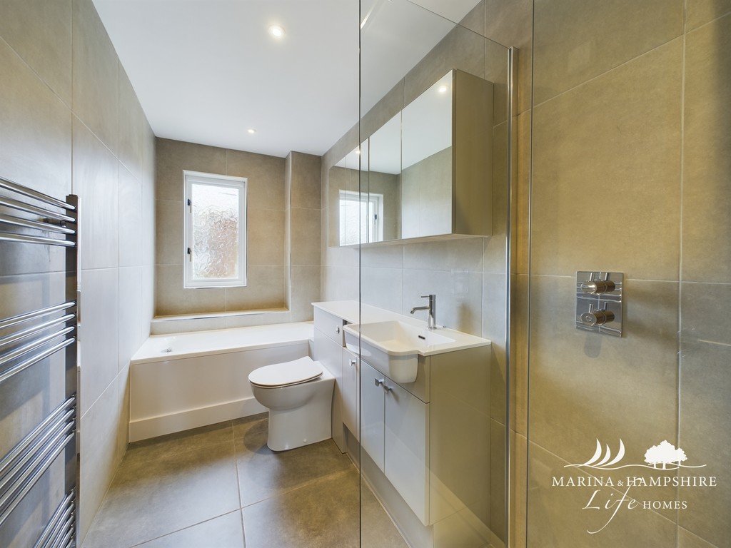 The contemporary theme continues on the second floor where you will find the recently fitted bathroom which is fully tiled to walls and floor and includes bath, wash hand basin inset into white gloss vanity unit and WC with concealed cistern. There is a separate shower cubicle with thermostatic shower fitted. The bathroom is finished with inset spotlights to the ceiling, heated towel rail and triple mirrored wall cabinet.
