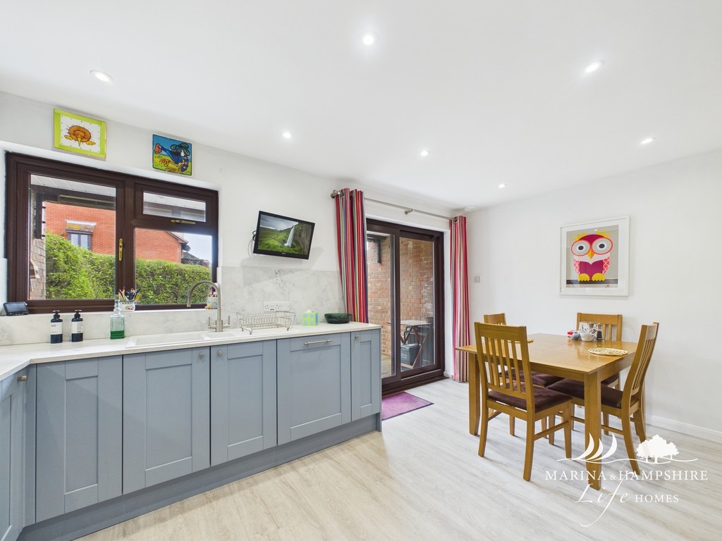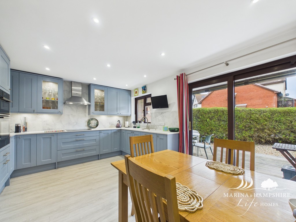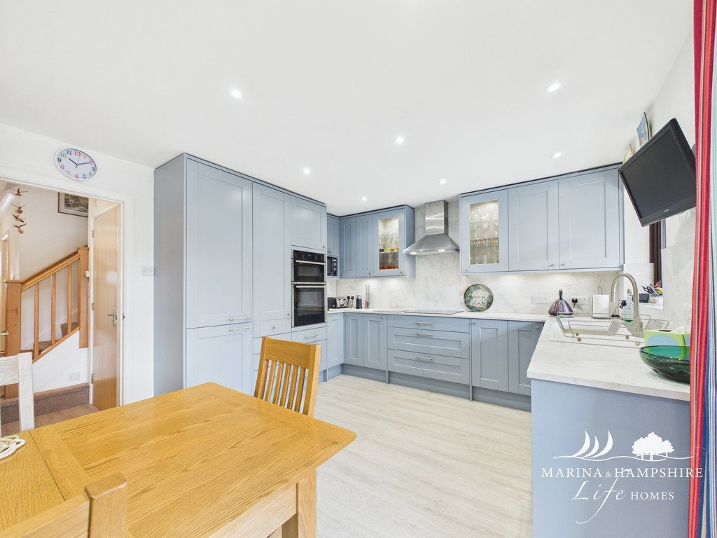 The ground floor welcomes you with a spacious entrance hall, setting the tone for the well-planned interior. A generous double bedroom with en suite shower room provides ideal guest or ground-floor accommodation. There is also a separate cloakroom where you will find plumbing for your washing machine. Across the rear of the property, a recently fitted shaker-style kitchen features co-ordinated white marble patterned worktops and a range of integrated appliances, plus plenty of space for a table and chairs. Sliding patio doors lead out into the rear garden, great for Summer entertaining.