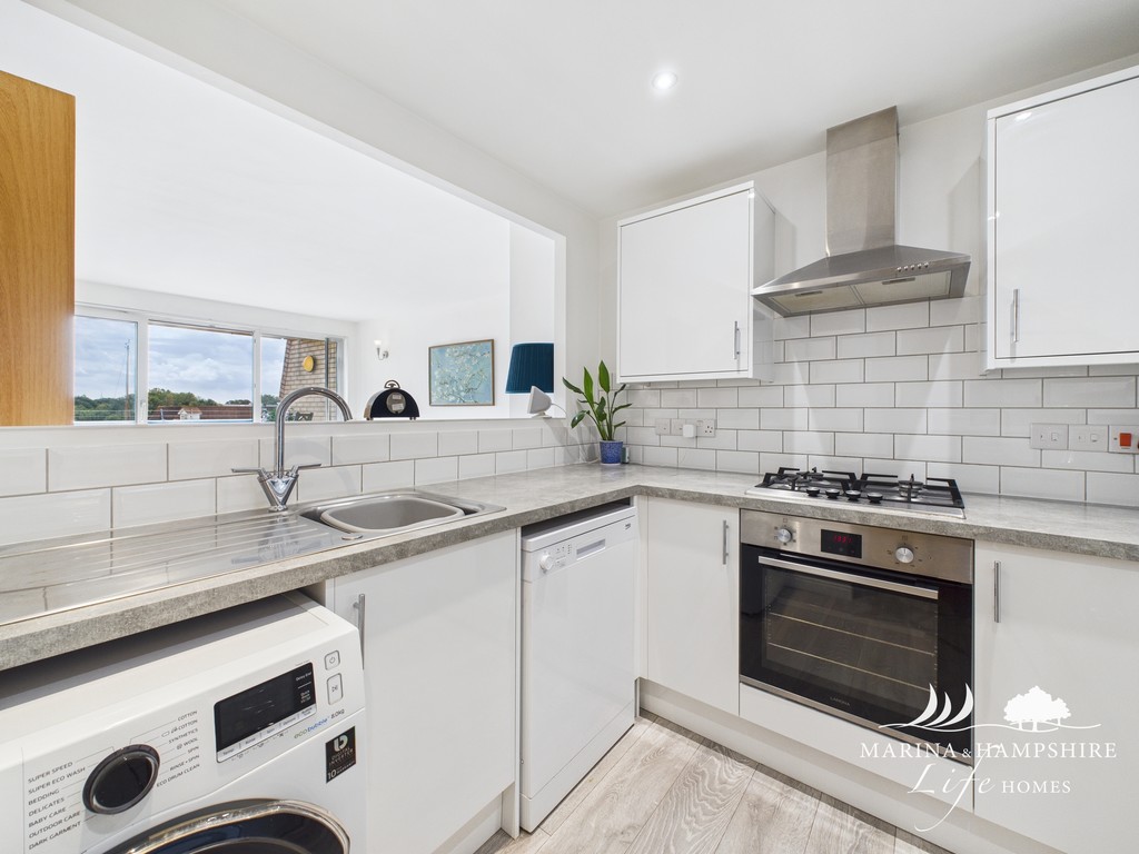 The modern contemporary kitchen is fitted with white gloss floor and wall cupboards with a grey worktop and matching grey vinyl wood effect flooring. There is a built in stainless steel gas hob, and undercounter electric oven as well as space for your washing machine, dishwasher and fridge/freezer. There is a framed open way onto the lounge, which offers views to the marina beyond.